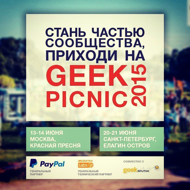 Если ты увлекаешься робототехникой и у тебя есть свой домашний робот, которого ты создал сам , или возможно это целая армия рукотворных роботов, то присылай свои работы на адрес content@exponenta.me и получи приглашение на одно из главных событий предстоящего лета в мире технологий GEEK PICNIC 2015, культовый фестиваль технологий, науки и искусств который пройдет в Москве (13-14 июня ) и Санкт Петербурге (20-21 июня ). Это то, чего ты так долго ждал - а именно показать всему миру свое творение и мастерство. Ты сможешь познакомиться с единомышленниками, поделится опытом, послушать лекции и просто весело провести время. Не упусти свой шанс заявить о себе, стань частью сообщества GEEK PICNIC.