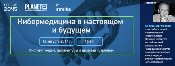 13 августа 2014 года Общественное движение «Россия 2045» организует научно-популярную лекцию доктора биологических наук Александра Фролова на тему «Кибернетическая медицина в настоящем и будущем» о продлении жизни и замене биологических тканей, органов и сенсорных систем искусственными устройствами.